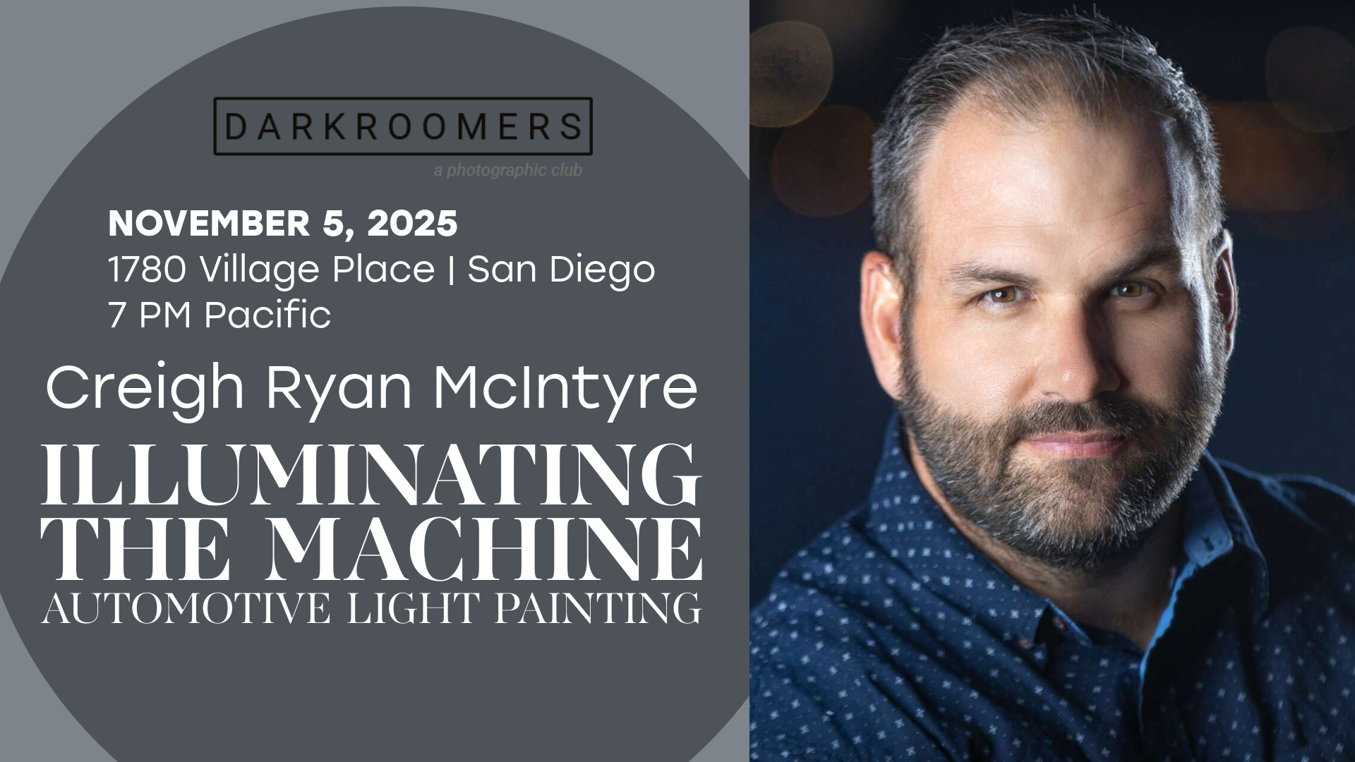Spend an evening learning how to think about painting your images with light. How long should your exposure be? What areas do you light first? How do you deal with shadows? What lens do you use to create the 3D effect that you want? What gear do you need to get started? Creigh Ryan McIntyre will share his Digital Workflow from start to finish.