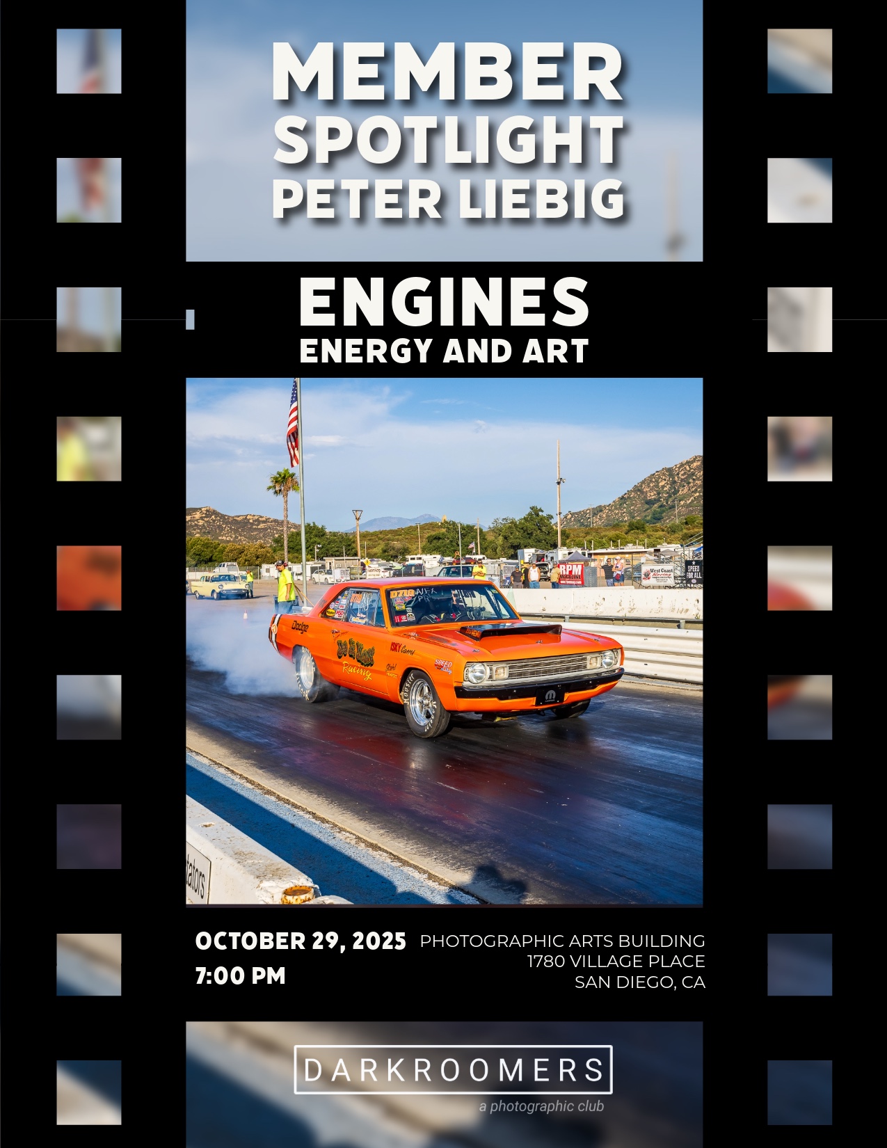Get to know Darkroomer and commercial photographer Peter Liebig in this Member Spotlight presentation. Peter will share his passion for capturing the excitement of motorsports, classic cars, and more—along with the creative artistry that transforms his images into unique digital paintings. Joined by his wife and partner, Wanda, Peter will give us a behind-the-scenes look at their dynamic journey.