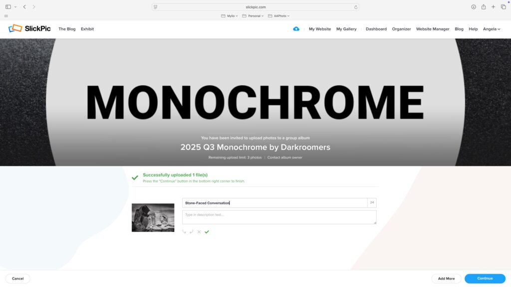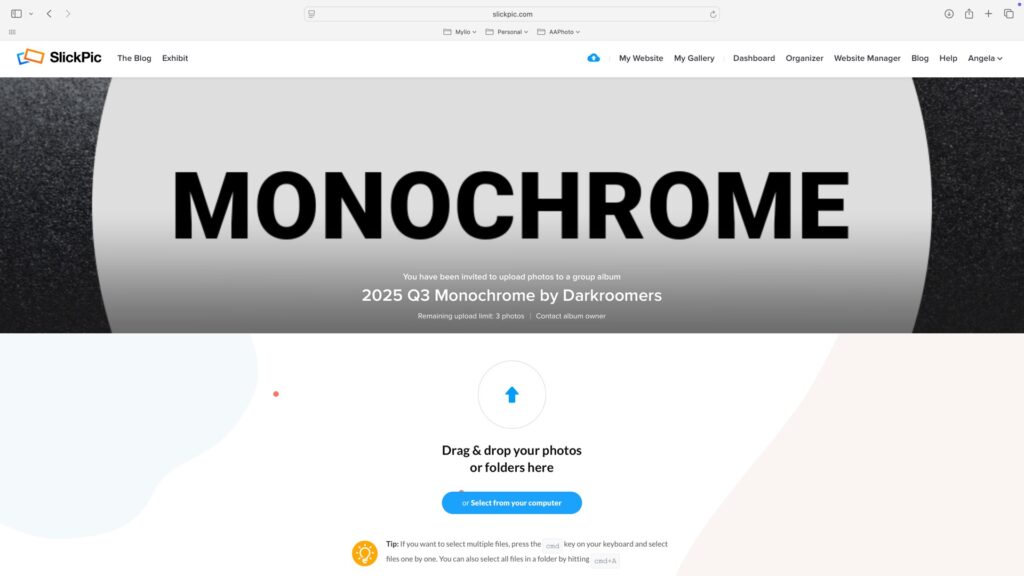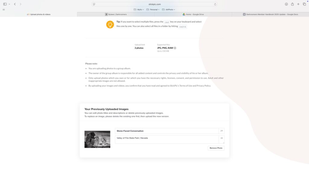 Drag and drop your photo(s) into the upload window OR click Select from your computer to browse your files (Finder on macOS, Explorer on Windows). Once your photo(s) appear, click Upload. You may enter up to 2 images in each category (2 in color, 2 in monochrome).